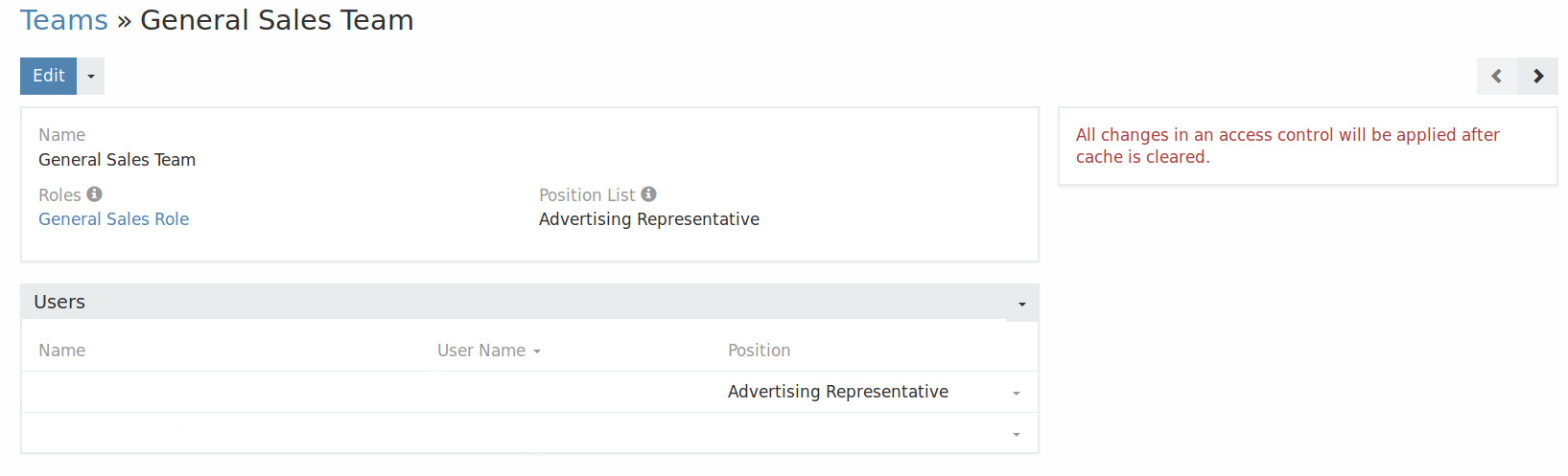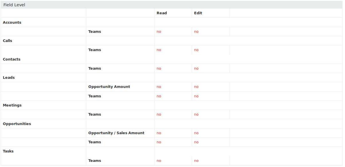 It effects real user permissions as well as the display showing the wrong user permissions. For example, after the change occurs, the non-admin user assigned to the General Sales Team and General Sales Role can make team and user assignments and can see Opportunity/Sales Amount. Clearing the cache doesn't correct the problem. I have to edit the settings for that user (while I'm logged in as an administrator), first by deleting the team and role settings and saving and then re-editing the user's settings to add back the team and role settings. Once I've done that, the problem is corrected.Last edited by krisk; 04-26-2016, 11:23 PM.Comment