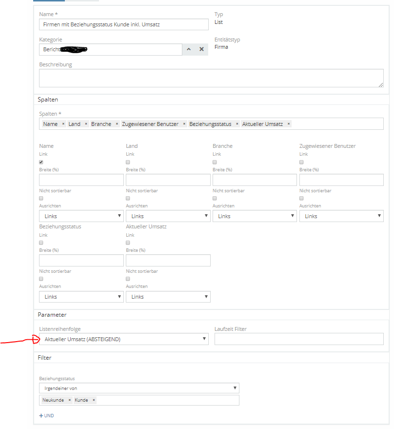 we've got an report for the entity "account", with a column "Umsatz" which is the value of a currency field.