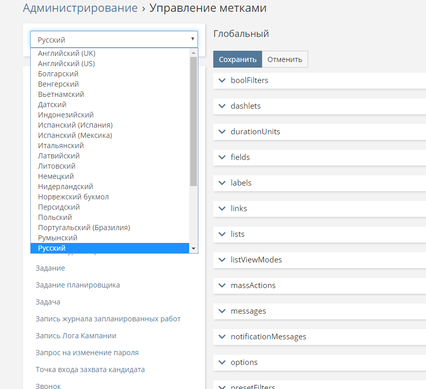 Language list in labels managment page