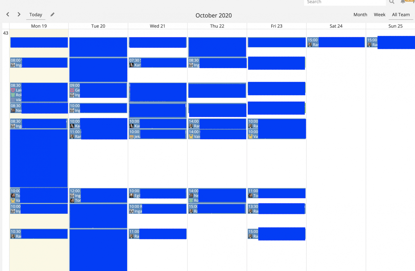 Hello. in Calendar if you'll look at week mode you can see/plan your week and see it by a hours of a day. If I would like to see a calendar of my teammates in the same week mode, I don't see a hours and all events are split randomly, so it's not possible in first look understand where are "free" slots. To get this information you need to look deep into details of the event.