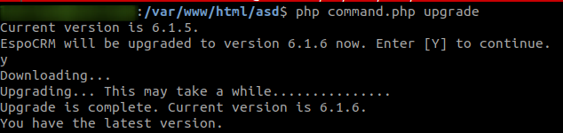 EspoCRM will be upgraded to version 6.1.6 now. Enter [Y] to continue.