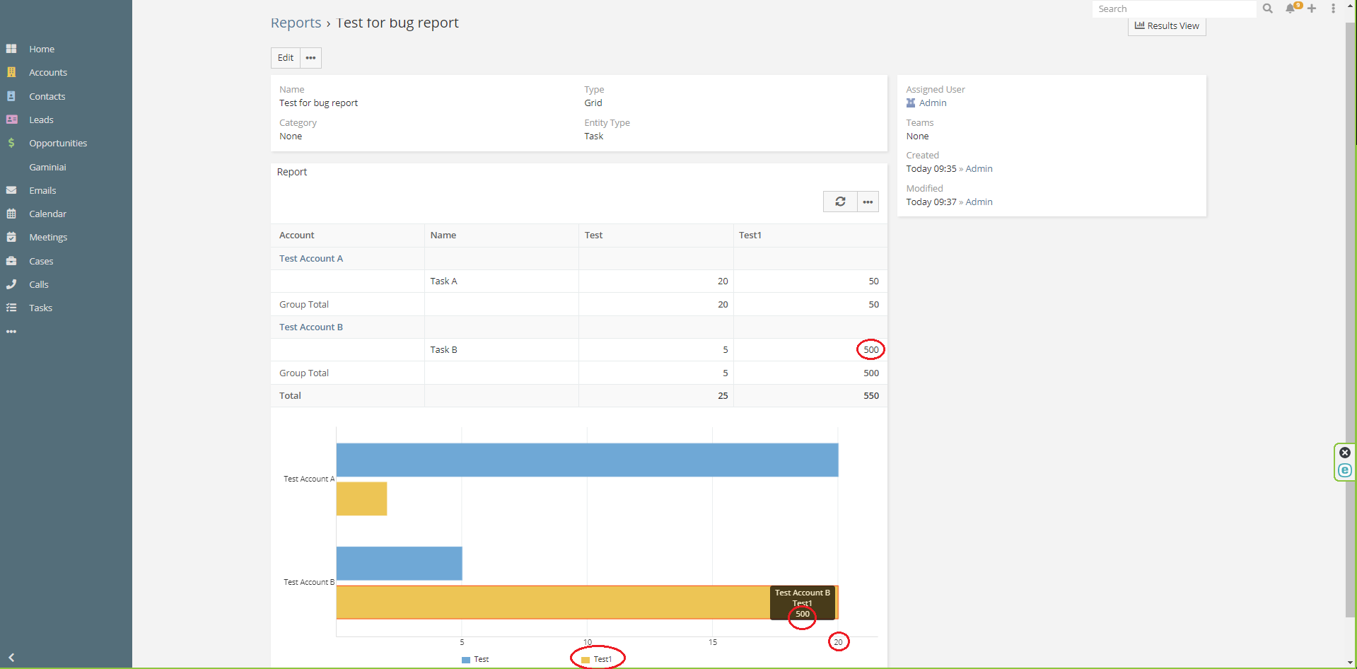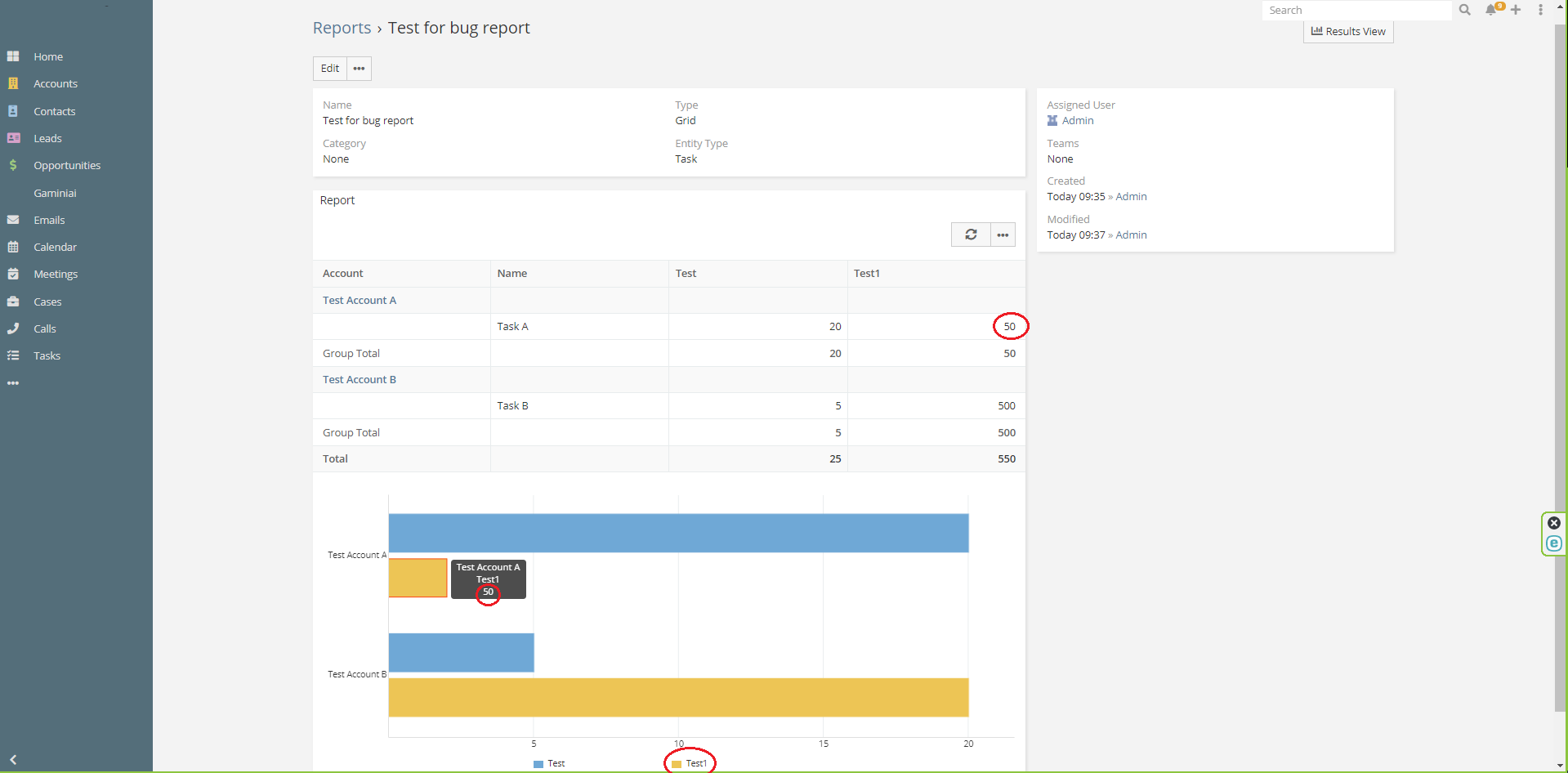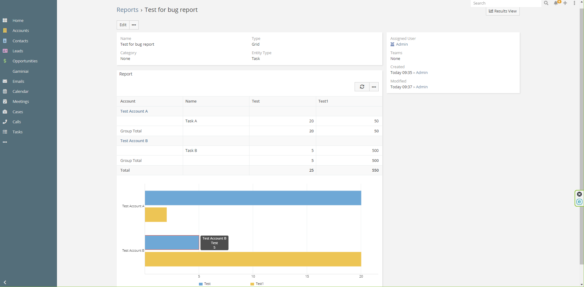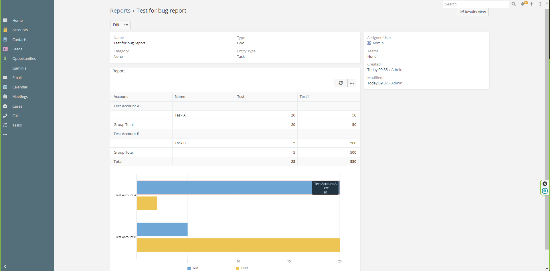 Name = Test for bug report; Group By = Account; Columns = “Name”, “SUM: Test”, “SUM: Test1”; Chart type = “Bar (horizontal)”