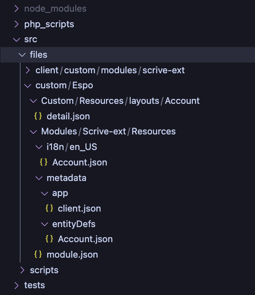 - Copy the changes in custom/Espo/Custom/Resources/layouts/Account/detail.json and paste them in my extension at custom/Espo/Modules/ExampleExt/Resources/metadata/layouts/Account/detail.json