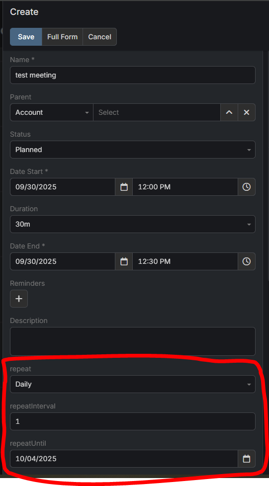 I will be completely honest, I don't really understand how coding works in espo, my knowledge of php is very limited, and espo is very difficult to understand, so I've just been using a lot of reference material to get to where I am. I uploaded screenshots of what the process looks like and what the results are currently, and I circled the part I added into espo myself. I don't know what is causing the meeting to duplicate twice a day instead of once. This also happens when you select weekly or monthly. Can someone help me with this please?