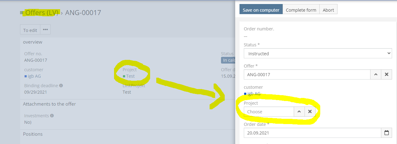 2. Adding a quote to a related project (quote n:1 project) and send it to customer