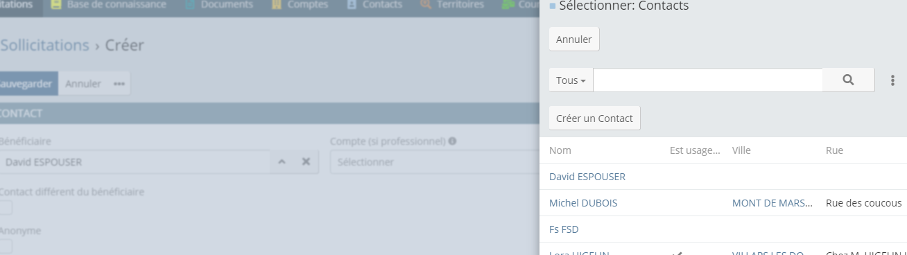 Currently, when I click on the select button, I open the modal window that lists all the contacts of the "Contact" entity :