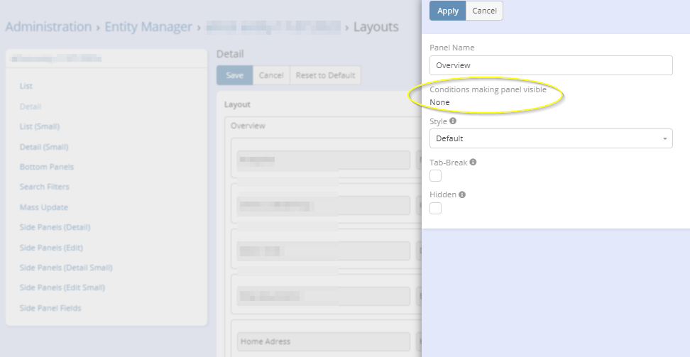 Please tell me if you have any conditions set in Administration > Entity Manager > your_entity_name > Layouts Detail > Layout > Overview > Conditions making panel visible?
