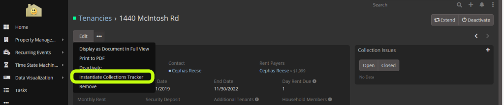 In our application, we have an entity class (scope) called Tenancy, and we wanted to add an option under the "Edit" menu in the Tenancy detail view, that will be available only when the Tenancy has a status "Active" and that when clicked will allow the User to instantiate a process called "Collections Tracker"