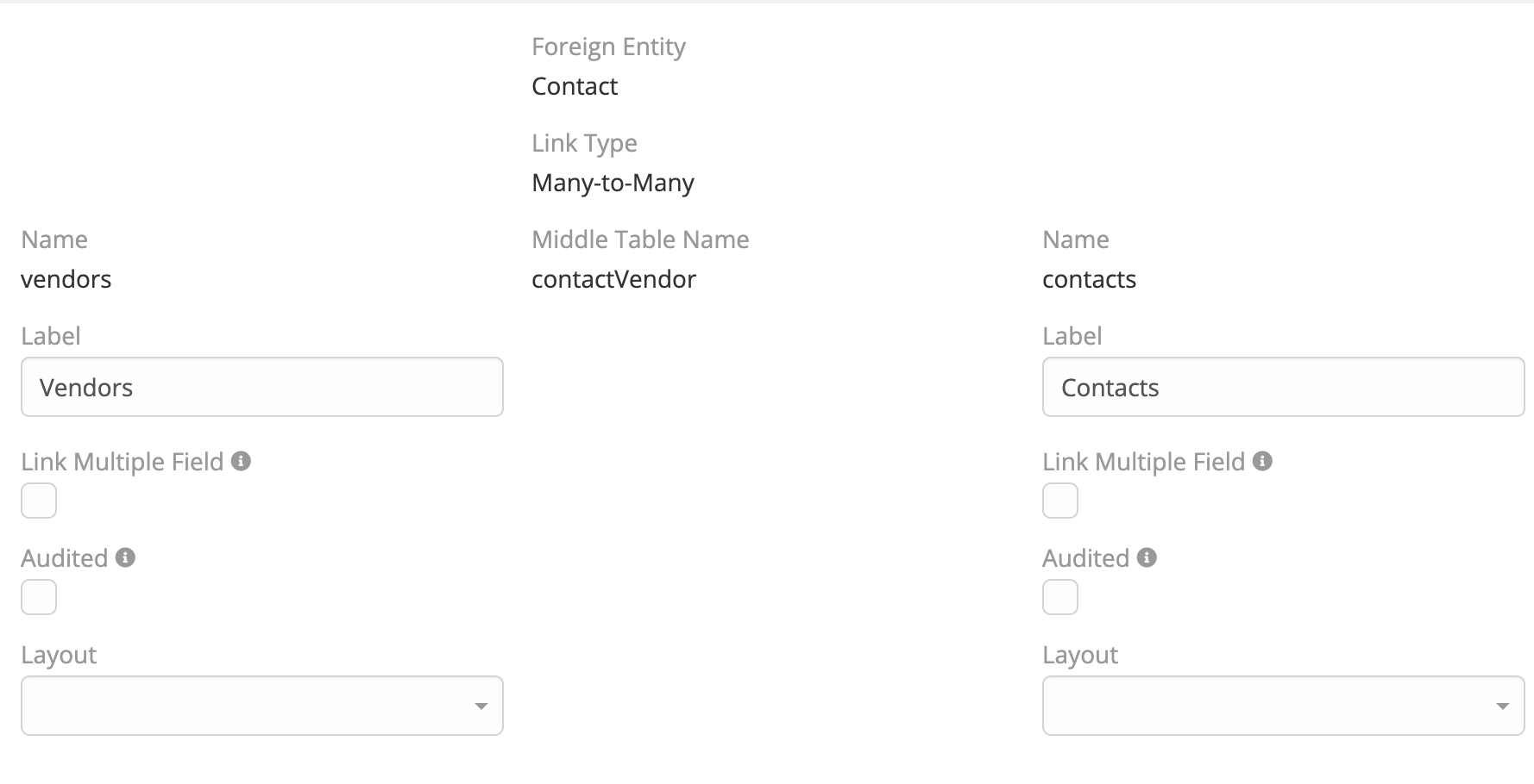 In summary, the relationship and additional column in the middle table have been established. What follows is the process for showing the value of additional column to the user. To accomplish that, each entity (Contact and Vendor) must be modified. Some of the modifications involve telling Espo to use non-storable fields. In other words, the fields are populated by relationships instead of directly from the database, which is the more typical method.