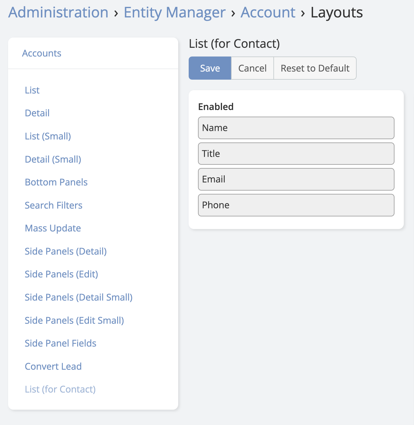 A similar list of steps must be implemented for the Contact entity in custom/Espo/Custom/Resources/metadata/entityDefs/Contact.json: