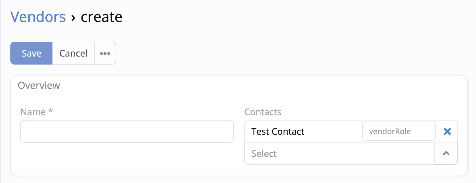 - Add several properties to the contacts field and modify some of the existing properties. I don't know what several of the properties do, so I won't try to explain. Copy, paste, and modify to fit your situation. Note: The value of the role property is vendorRole; this value must match the name of the non-storable field in the Contact entity.