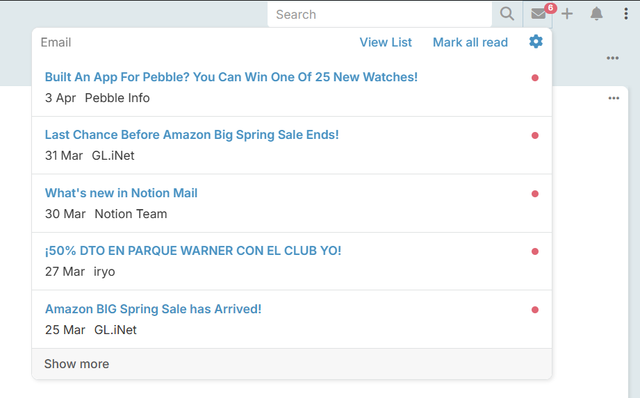 It adds an envelope icon to the top navigation bar that lets you quickly browse your latest inbox emails without leaving the current page. A badge on the icon shows the number of unread messages at a glance.
