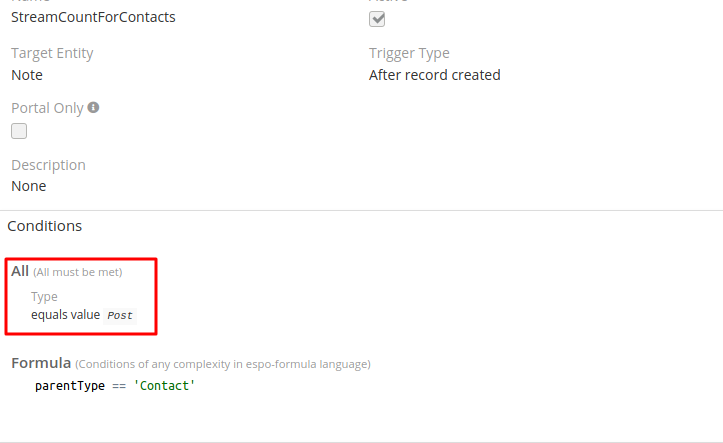 When I add an Integer field "streamCount" into Contact entity. And set a workflow to make the "streamCount" +1 when a new stream note is created.
