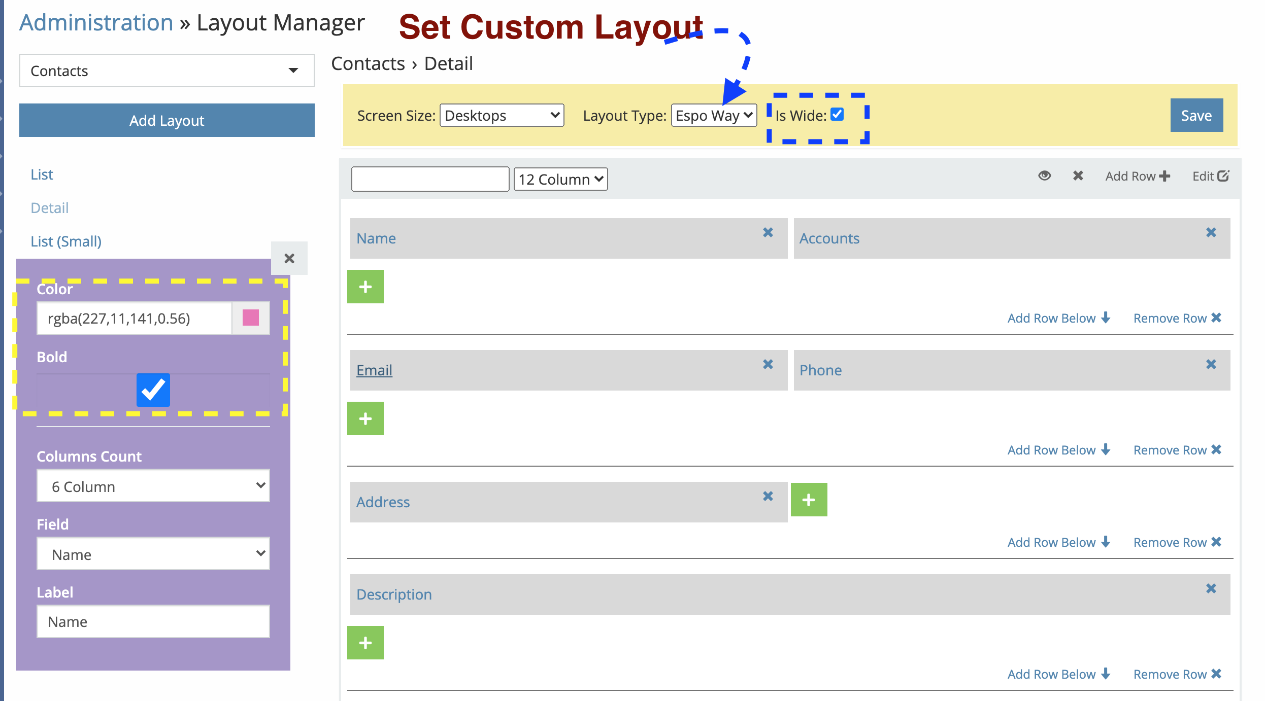 - the columns can be set to different sizes whereas in espocrm you have equal columns only