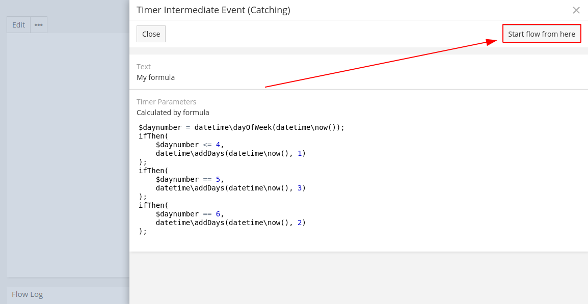 3. Open the Timer Intermediate Event -> Click "Start flow from here" (see screenshot)