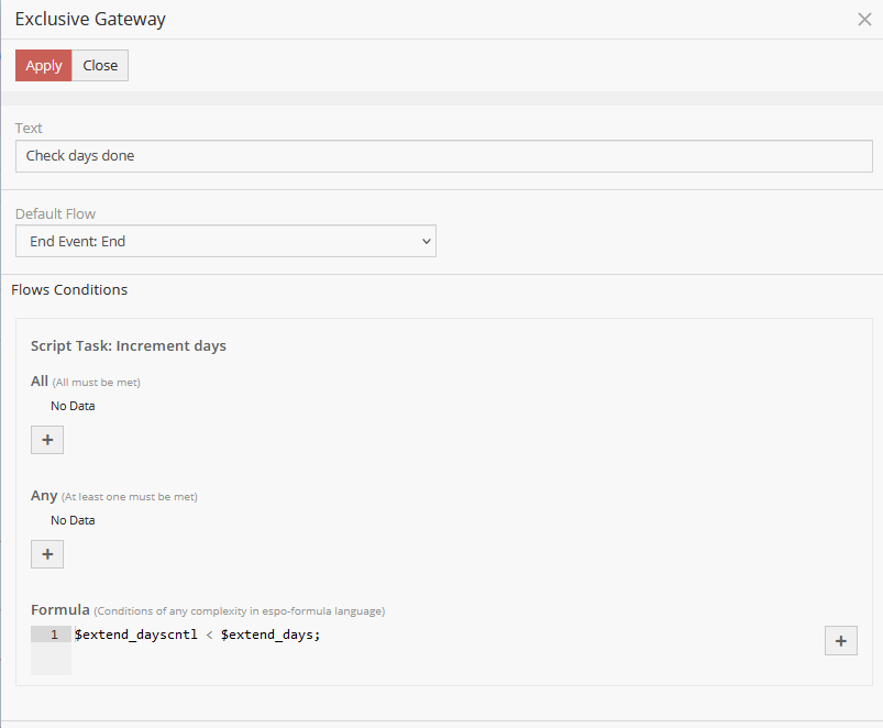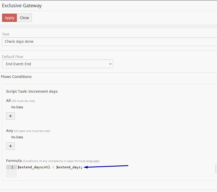 I am having a great deal of trouble in defining the condition for a gateway in flowcharts. Main reason is that there is no documentation or examples for defining them. What i am doing is defined in the main process flowchart (refer to screencap). In the exclusive gateway, i trying to check if one variable is less then another variable. If it is, then execute the "Increment days" script task otherwise take the default path(which is "End"). See screencap for gateway definition. When i run the process it always executes the default path. I am not sure if I have defined the condition correctly. The other definition is tried was and did not work was: