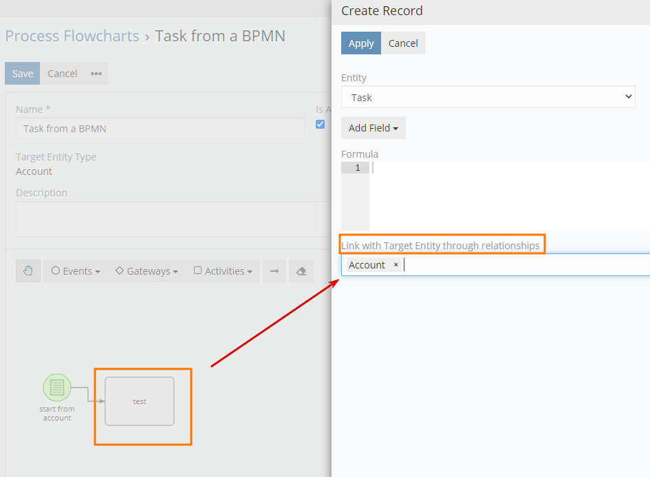 I want to create a task from a BPMN process. The target entity type is Account. The process is started from the account mask.