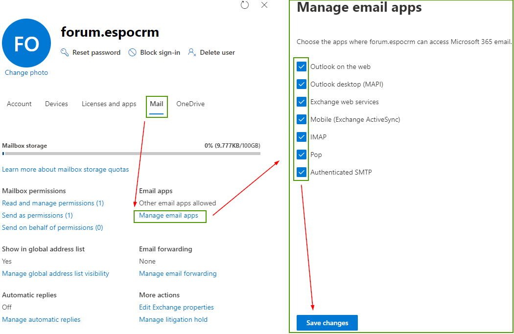 - Go to your User's profile and in Mail tab -> Manage email apps check the items shown in screenshot 2.