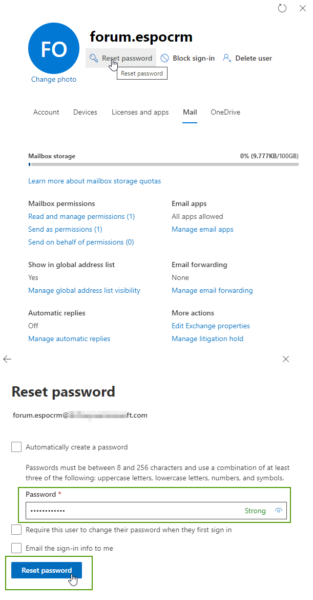 - Click Reset password in the User profile. Enter a reliable password for the shared mailbox and save the changes (screenshot 3).