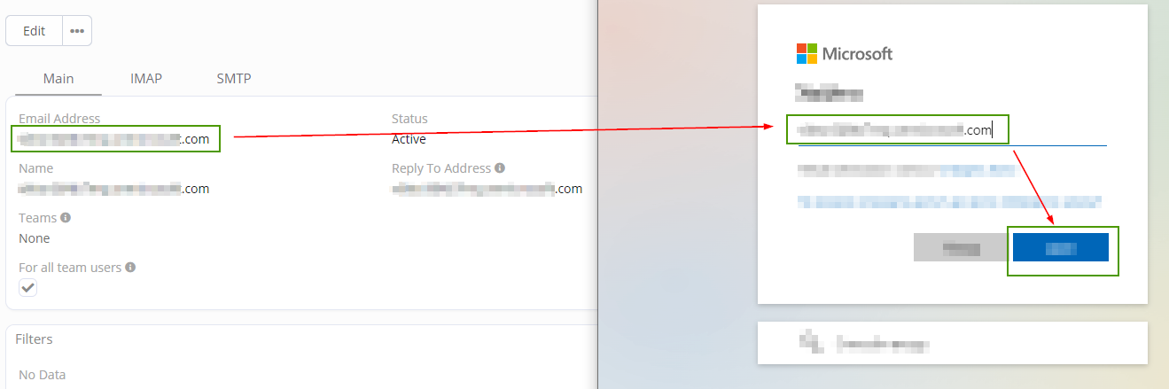Note that during connection to Microsoft (screenshot 4), your login is the shared mailbox, and the password is the password from your shared mailbox created in step 3. - After a successful connection, click the Test Connection button in the IMAP tab of our Personal or Group Email Account. We perform a test sending in the SMTP tab of our Personal or Group Email Account via the Send Test Email button.