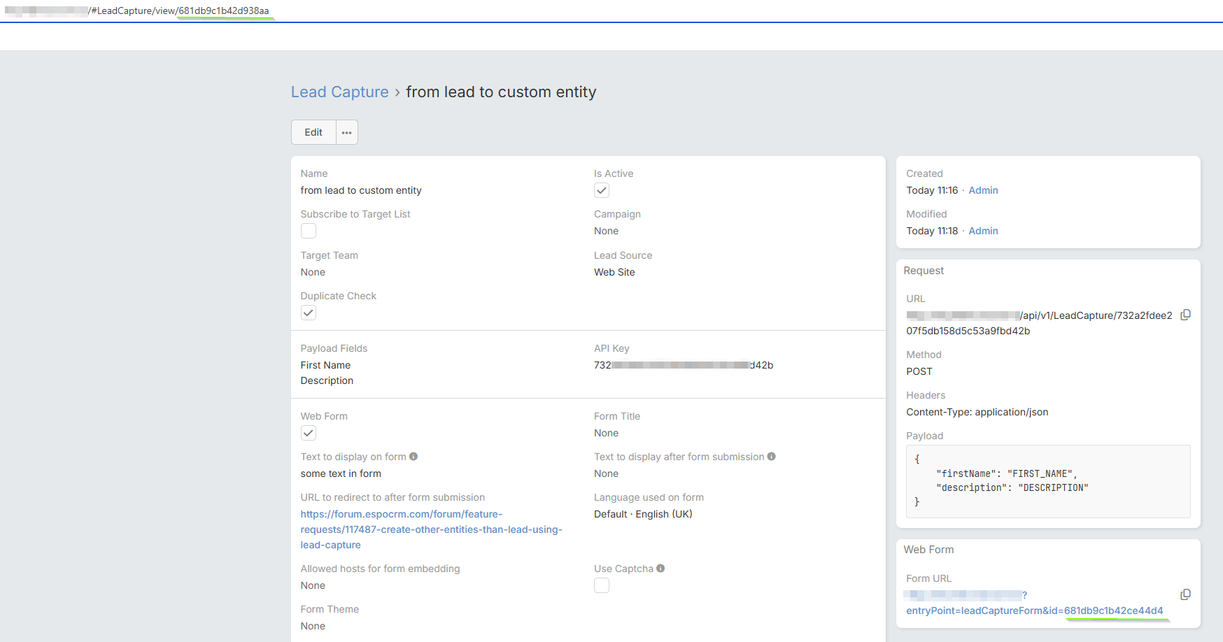 - For each separate entity (custom or system) create a separate Lead Capture. In screenshot 1, pay attention to the ID of the created Lead Capture. You need to copy it for the next step.