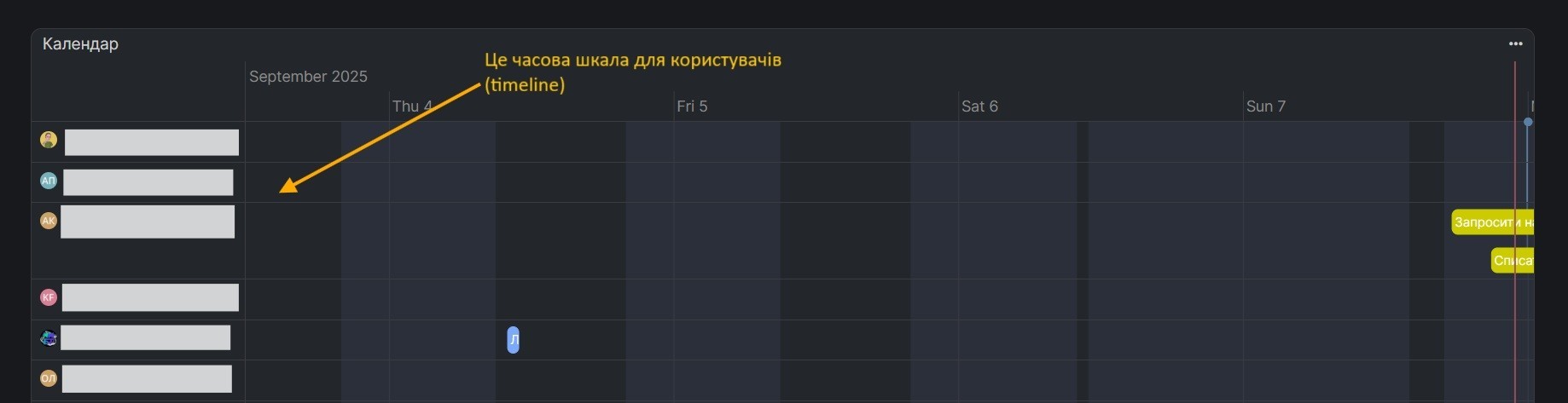 Proposal to add a timeline display layout. Using the example of displaying a timeline in the user calendar (on the print screen):