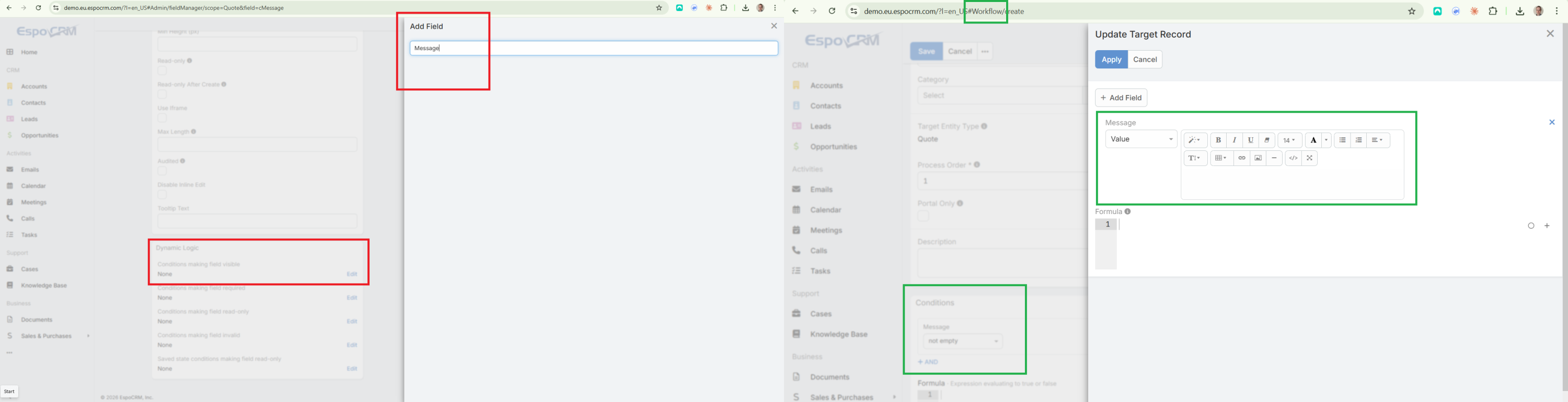 Currently, "Wysiwyg" fields are available in Workflow, but they cannot be selected in Dynamic Logic. Because of this, they cannot be used in visibility, required, read-only, or similar UI conditions.