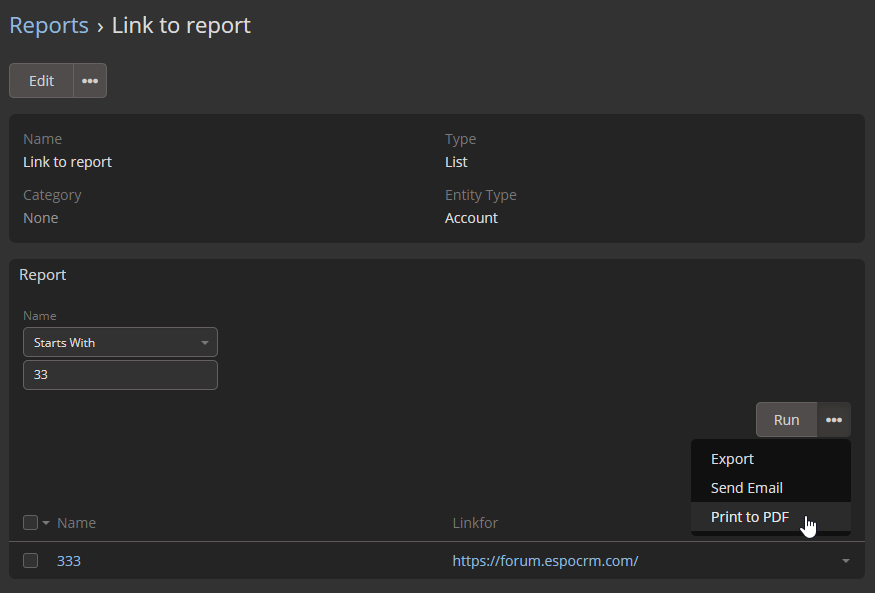 I have this use case quite often. I want to create a PDF from a report, apply filters and add links. This PDF i'm sending to users of espocrm.