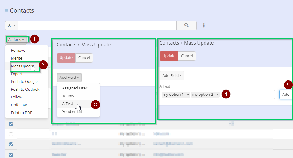 - Then click Actions > Mass Update > Add Field and select Multi-Enum field (screenshot 2).