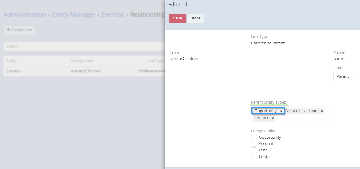 In Administration > Entity Manager > Your_event_entity_name > Relationships in relation Children-To-Parent just add the Opportunity in Parent Entity Types and save the changes (screenshot 1). This relationship is created automatically after the creation of an entity of Event type.