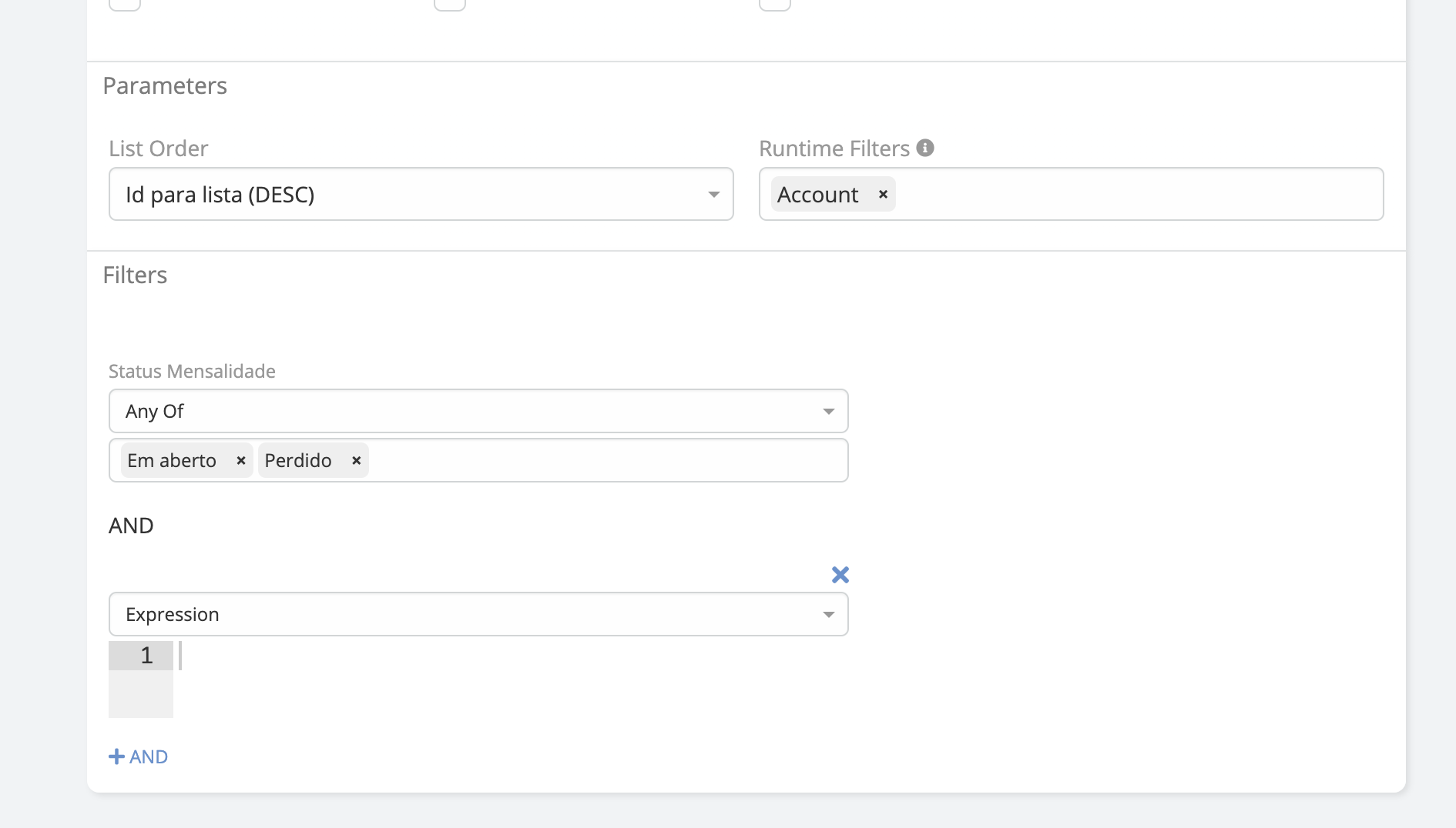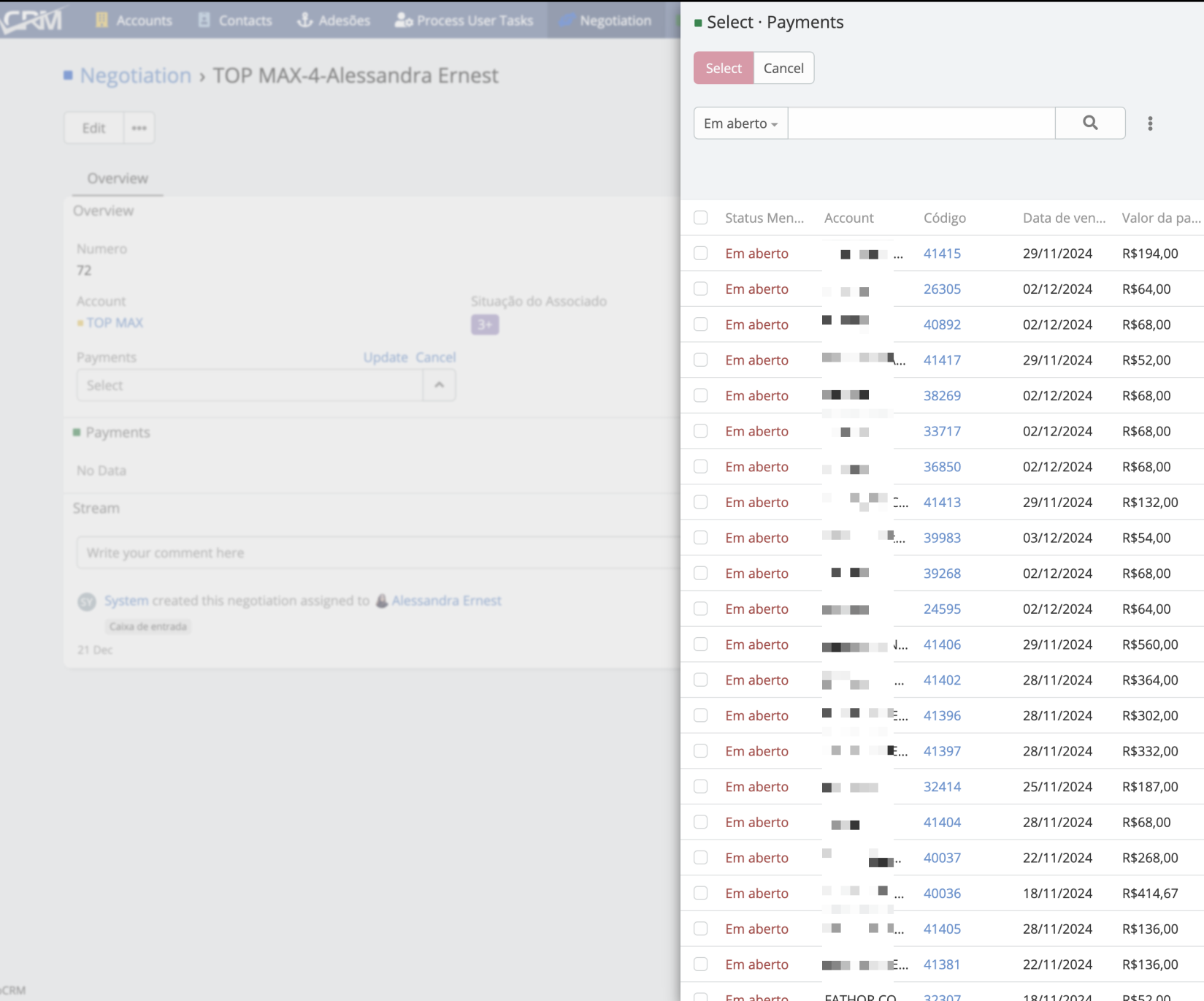 When creating a new negotiation and selecting the fees to be linked, I need the list to show only those linked to the same account as the negotiation. I have already created a filter to list only the open (overdue) fees, but I also need a predefined filter that lists only the open fees for the associated account.