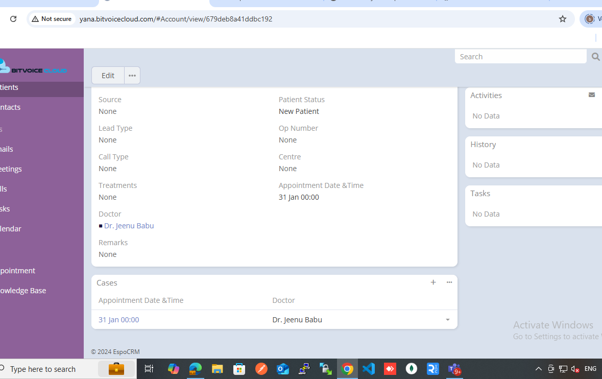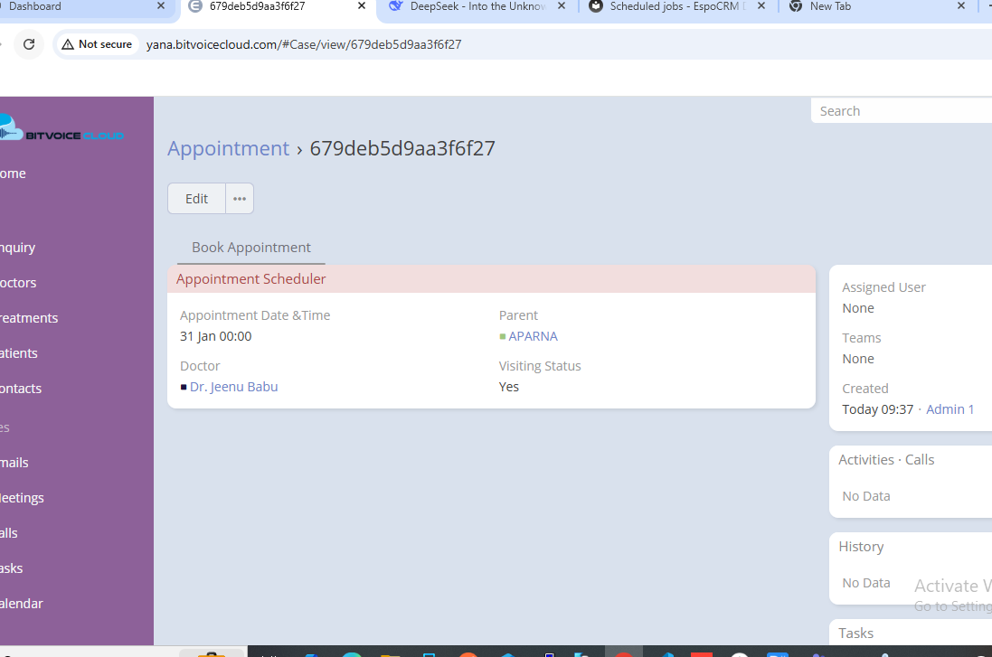 The Opportunity entity (renamed from Enquiry) contains patient details, while the Appointment entity contains scheduling details. When the Visiting Status in the Appointment entity is set to "Yes," a new Account should be created for the patient.