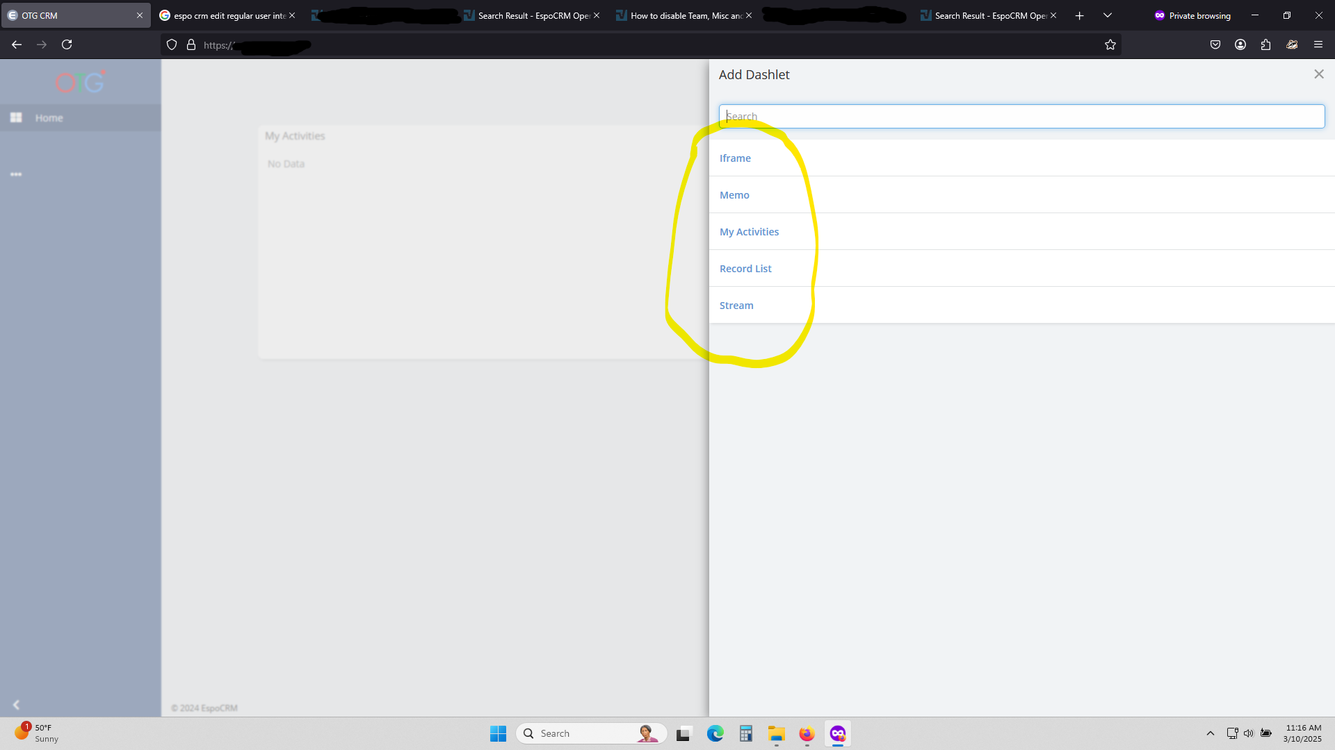 Hi All, I would like to say this is a great CRM but as a newbie and not a programmer, I am having difficulties setting up the dashboard. I am using ESPO Version 8.4.2 The problem is that I am setting up one user with regular access (I have not set anyone else except myself) so there are no admin rights assigned to this user. The problem is I go in to customize the home page but am unable to do so. I cannot even reset the user as I do not see a reset button anywhere. I have attached screen shots to help explain my predicament. Sorry if I did not provide enough info, I do not know what else to tell you. In picture EX D I have circled the optional dashlets but the ones I need are not part of that list e,i, email and calendar. How can I add those dashlets to that list?