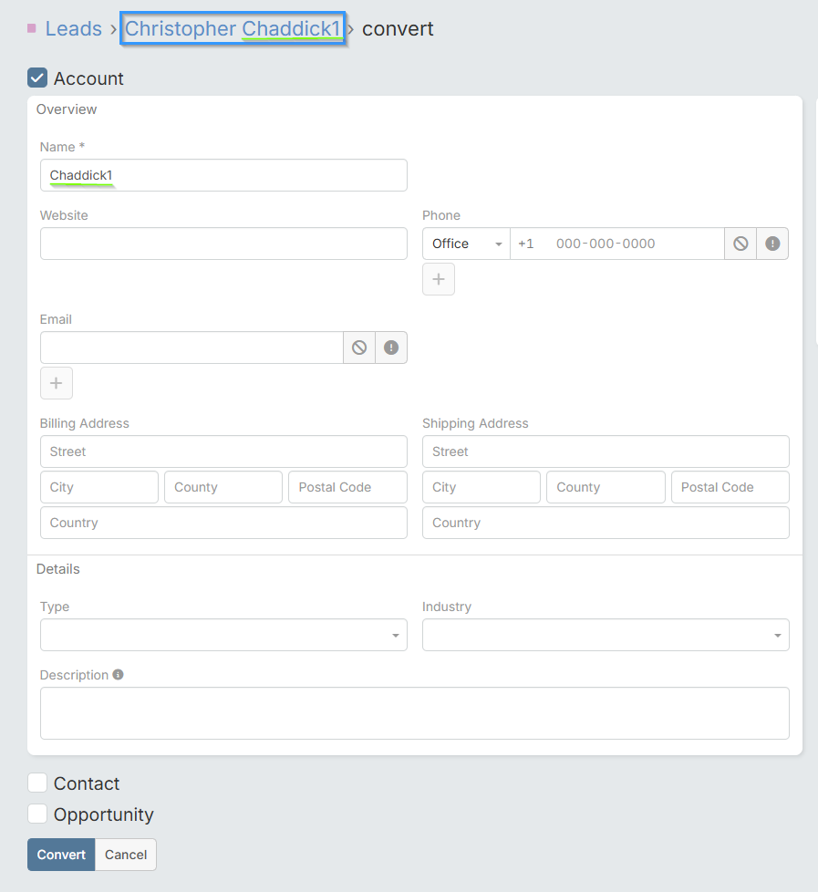 - Refresh your Lead page and try converting. Depending on the code option you selected, you will automatically have the firstName or lastName value substituted into the name field of the created Account (screenshot 2).​