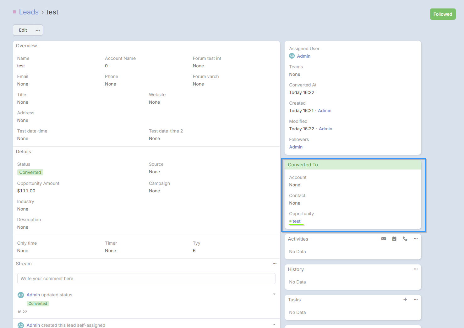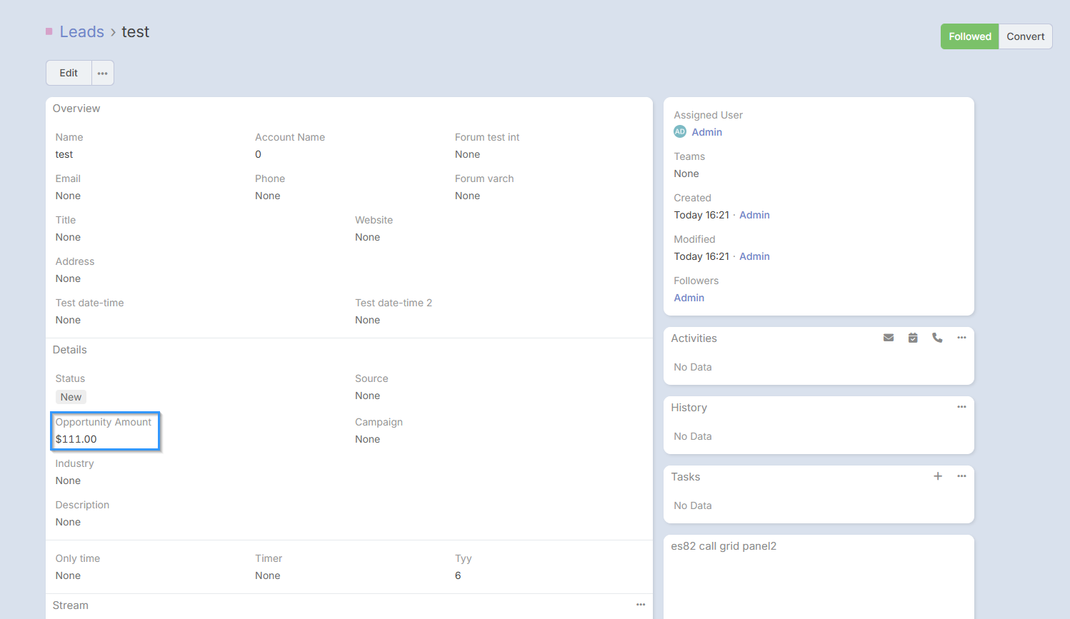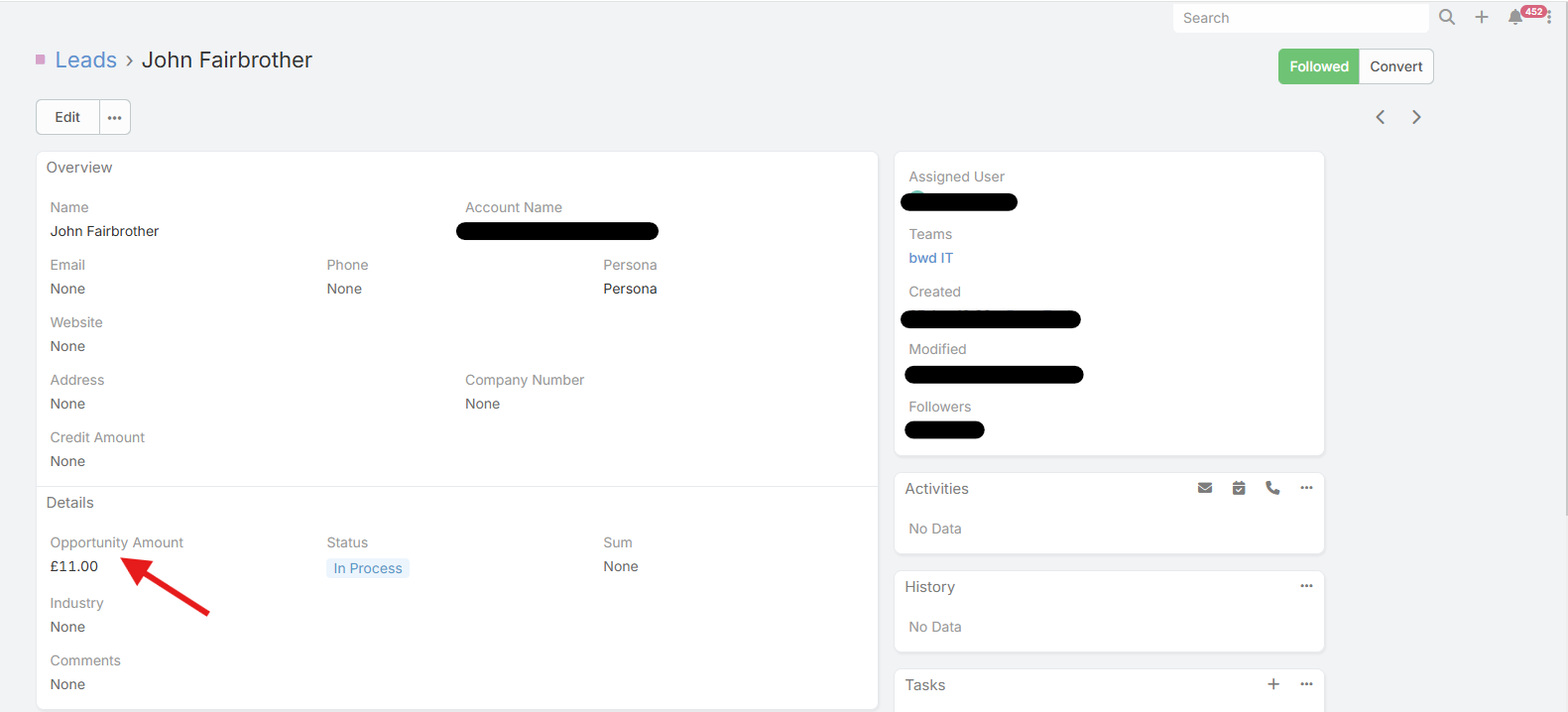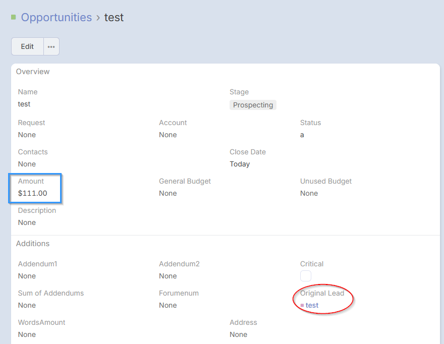 "Opportunity Amount" is a field that was populated in a specific Lead entity record (screenshot 1).
