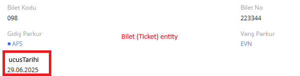 Please tell me, do I understand correctly that the Bilet (Ticket) entity and the Ucustarihi entity are connected by One-to-Many relationships? That is, one ticket can have several ucustarihi records? This is very important, as it affects the correctness of the formula script.