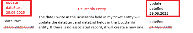I added it visually to better express what I want to do. In short, I have a single date field in my main entity (ucusTarihi). The name of the entity I created a new record for is also Ucustarihi. When I update the ucusTarihi in my ticket main entity, I want my two date fields in the Ucustarihi entity to be updated with the ucusTarihi in my main entity.(dateStart and dateEnd)