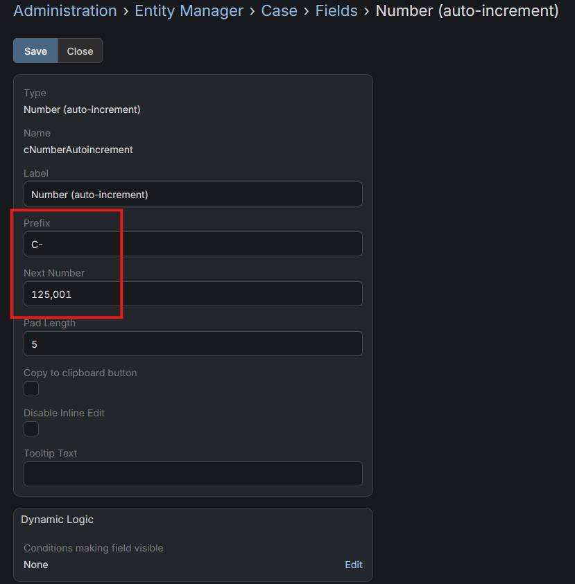 I'm in Administration > Entity Manager > Case > Fields and there's "Number". When I open it, there isn't much to edit except Label and Tooltip Text. I added the field "Number (auto-increment)" and see some more customization options so I added "C-" as a prefix and then tried to set the Case number, but new cases are still incrementing from the old Case numbers. Would appreciate any help if someone knows the solution to this. I have a background in systems admin and cybersecurity but I am no programmer or coder so if it takes custom coding, please explain it to me like I'm 5 lol : )​