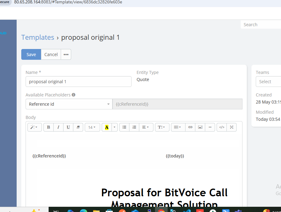 I’ve added a custom auto-increment field cReferenceId in the Quote entity. It shows correctly in the Entity Manager and is available as a placeholder {{cReferenceId}} in the PDF template.