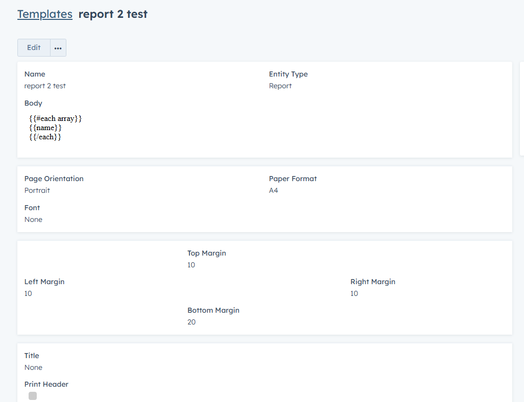 - If I use a report entity template, I get one file, but I can’t seem to apply my own styling — HTML either comes out as plain text or the #each iterator produces nothing.
