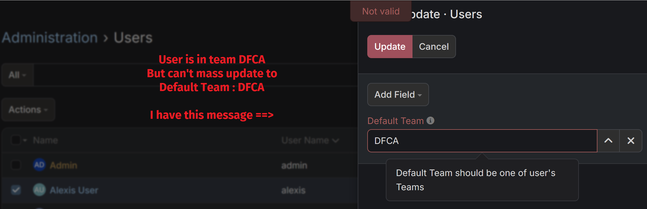 Mass Update "Default Team" fails with "Not Valid" despite user being in the team