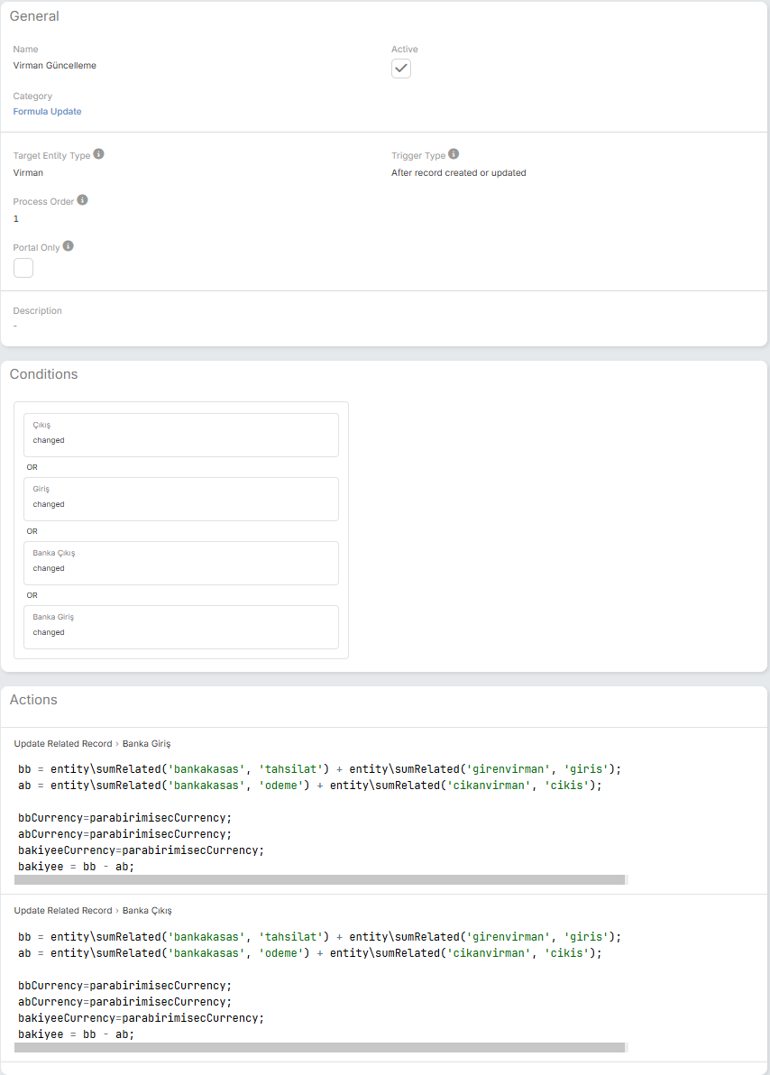 When a new Virman record is created, a Workflow updates the related Bank record (for example, adds or subtracts amounts based on transaction type).