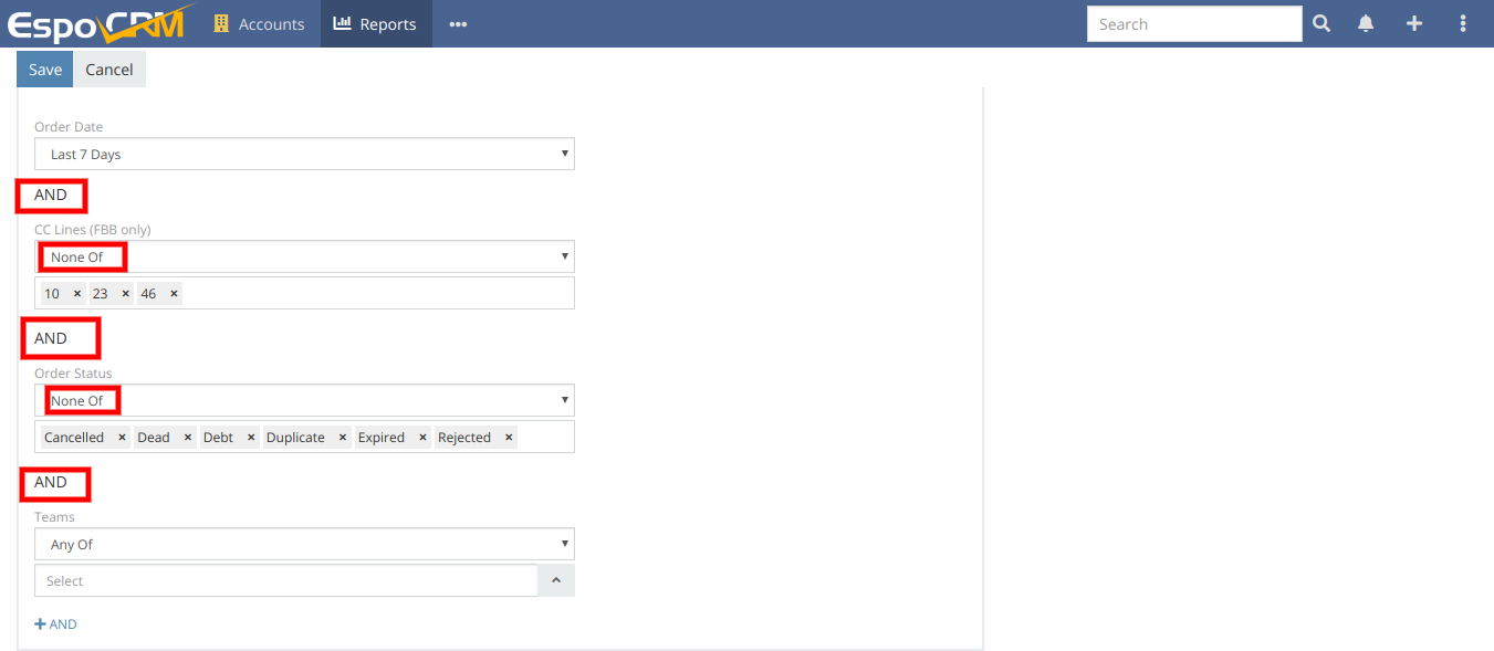Here is an example of the query that the CRM is shooting over to mysql with and without the teams field in the report filter.