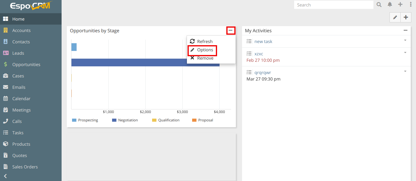 In this opportunities by stage dashlet, for stages in opp entity im using custom stages. It's seems to be the reason for this.