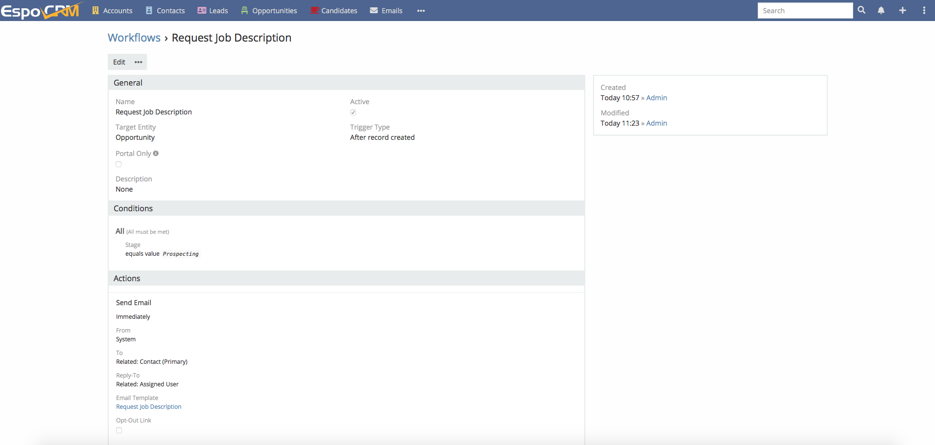 I created a workflow which is triggered by an record being created and immediately an email should be sent to the contact person of that opportunity, given that that opportunity stage is "prospecting". Though the workflow runs through as can be seen in the log, it does not send any email. There were no error messages and as far as I could tell the workflow ran smoothly.