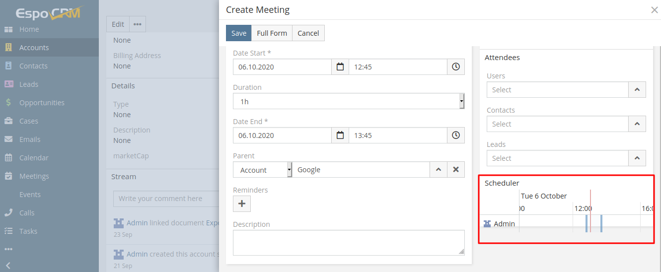 2. Create the file or add to the file: /custom/Espo/Custom/Resources/metadata/clientDefs/Meeting.json this code:Code:define('custom:views/meeting/record/panels/scheduler', 'views/record/panels/side', function (Dep) { return Dep.extend({ templateContent: '<div class="scheduler-container no-margin">{{{scheduler}}}</div>', setup: function () { Dep.prototype.setup.call(this); var viewName = this.getMetadata().get(['clientDefs', this.scope, 'schedulerView']) || 'crm:views/scheduler/scheduler'; this.createView('scheduler', viewName, { el: this.getSelector() + ' .scheduler-container', notToRender: true, model: this.model, }); this.once('after:render', function () { if (this.disabled) return; this.getView('scheduler').render(); this.getView('scheduler').notToRender = false; }, this); if (this.defs.disabled) { this.once('show', function () { this.getView('scheduler').render(); this.getView('scheduler').notToRender = false; }, this); } }, actionRefresh: function () { this.getView('scheduler').reRender(); }, }); });