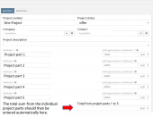 Thanks, but I don't understand exactly what to do. I don't want a sum of different projects, but a sum of a project with several parts. I have a project form, there are five currency fields listed. Then I created another currency field, in this field the amounts from the five fields mentioned above should automatically be output as a total. Perhaps the picture illustrates a little more precisely what I am imagining.1 PhotoComment