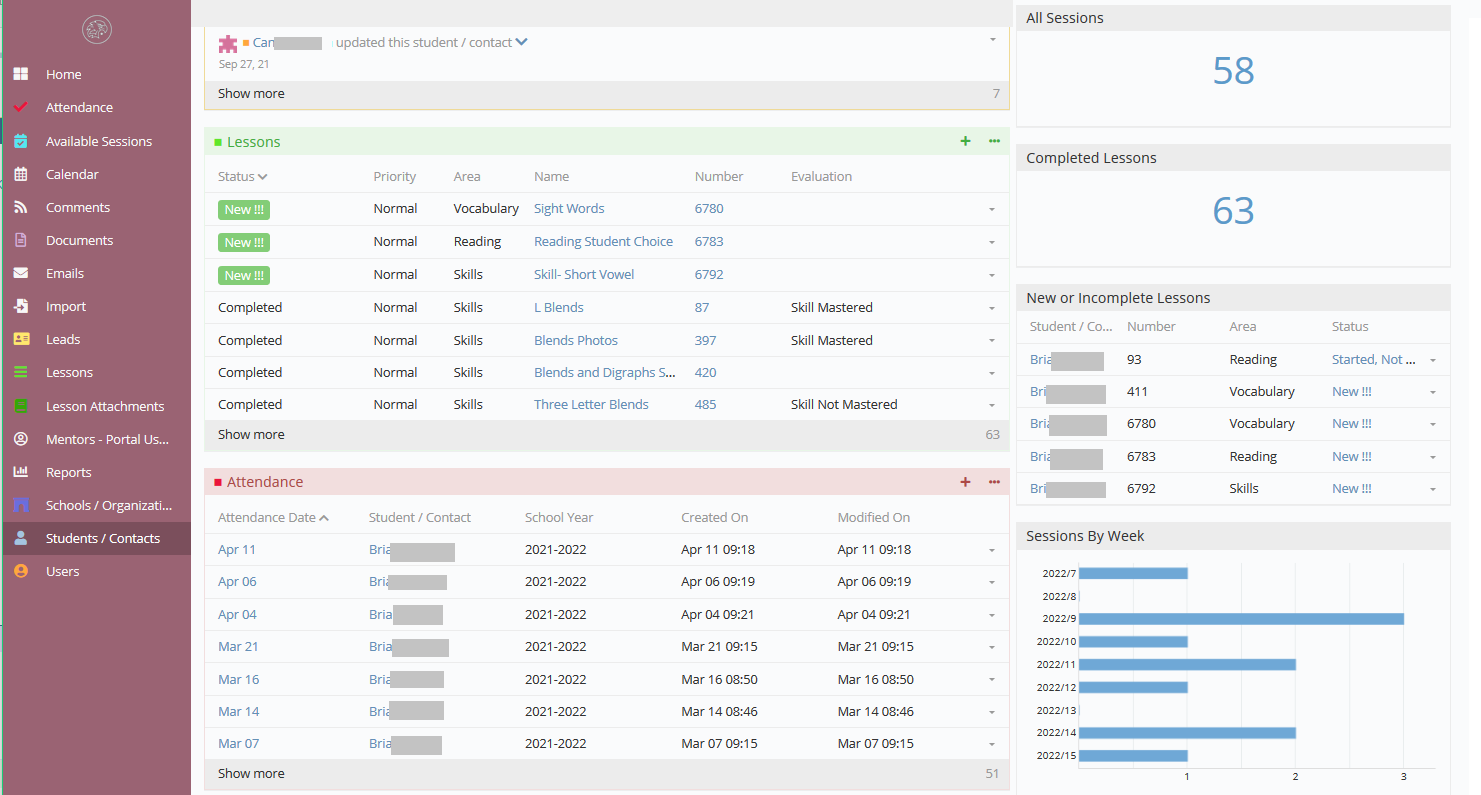• Status and sorting helps the mentor find the next lesson, key since it probably is a different mentor or student than before