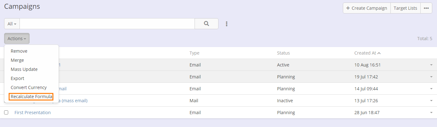 While I can enter the formula in the campaigns module, the 'recalculate formula' option is never made available in the drop down menu - so the formula can never be run.