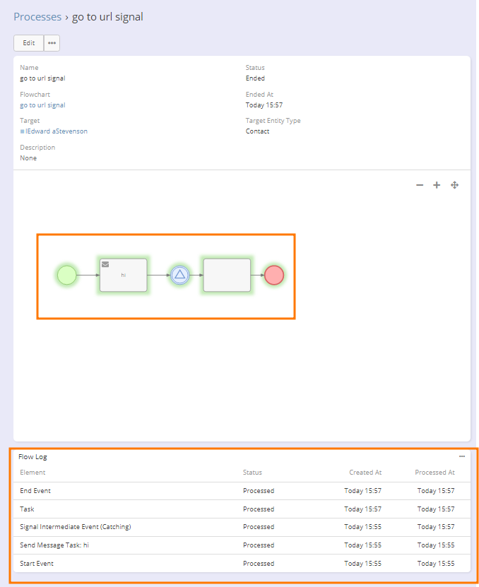 III. In Administration > Process Flowcharts, create a process with settings as shown in screenshots 2 and 3. Screenshot 3 shows Signal Intermediate Event (Catching) clickUrl.Contact.{$id}.637751e2ef34b53fc, when: